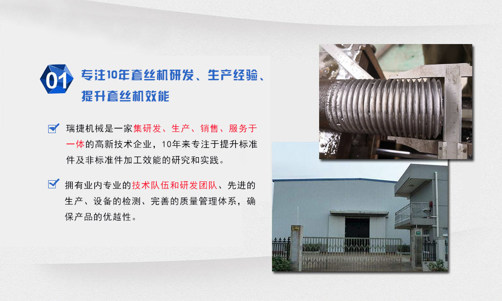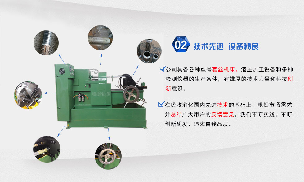 本套絲設備屬于無削加工設備,運用特殊的切削技術,上絲輕盈快捷,提高生產效率,采用三點一線,同心度高,性能穩(wěn)定等優(yōu)點,本機每分鐘可切削3-5根工件,速度快,效率高,對于一些不定長度的鋼結構公司,橋梁工程,電力設施等大企業(yè)的批量生產之需要。